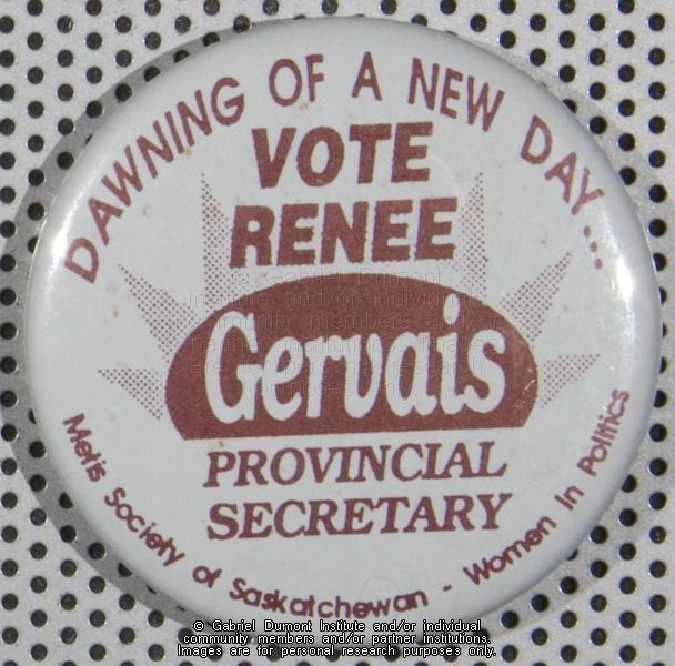 | Description: | Vote Renee Gervais for Métis Society of Saskatchewan Provincial Secretary election button. |