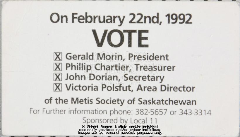 | Description: | Métis Society of Saskatchewan election advertising urging voters to elect Gerald Morin, Phillip Chartier, John Dorian, and Victoria Polsfut. |