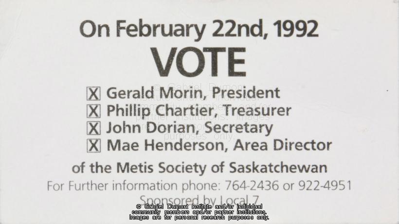 | Description: | Métis Society of Saskatchewan election advertising urging voters to elect Gerald Morin, Phillip Chartier, John Dorion, and Mae Henderson. |