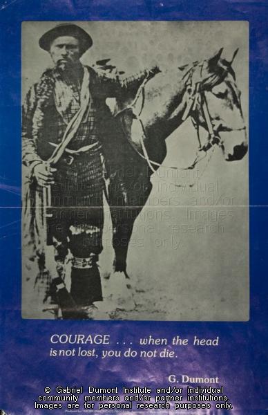 | Description: | Poster with photograph of Gabriel Dumont and quote attributed to him. |