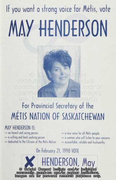 | Description: | "Vote May Henderson for Provincial Secretary of the Métis Nation of Saskatchewan" election poster. |