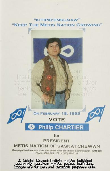 | Description: | "Vote Philip Chartier for President, Métis Nation of Saskatchewan" election poster. |