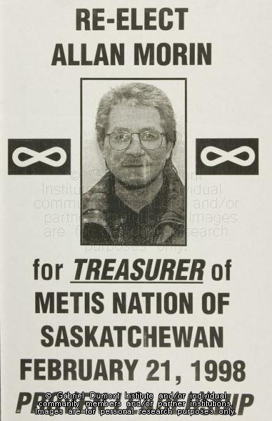 | Description: | "Re-elect Allan Morin for Treasurer of Métis Nation of Saskatchewan" election poster. |