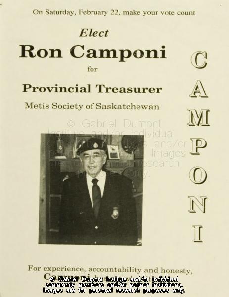 | Description: | "Elect Ron Camponi for Provincial Treasurer, Métis Society of Saskatchewan" election poster. |
