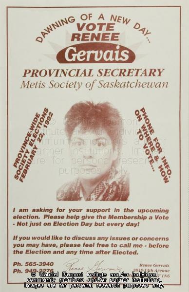 | Description: | "Vote Renee Gervais, Provincial Secretary, Métis Society of Saskatchewan" election poster. |