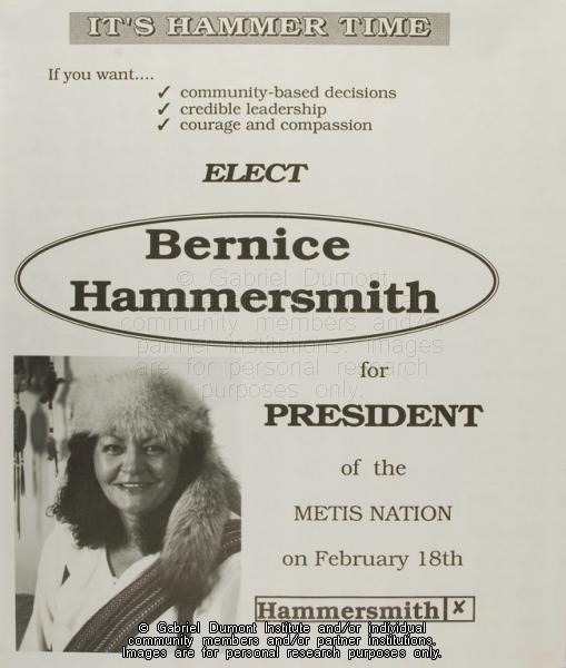 | Description: | "Elect Bernice Hammersmith for President of the Métis Nation" election poster. |