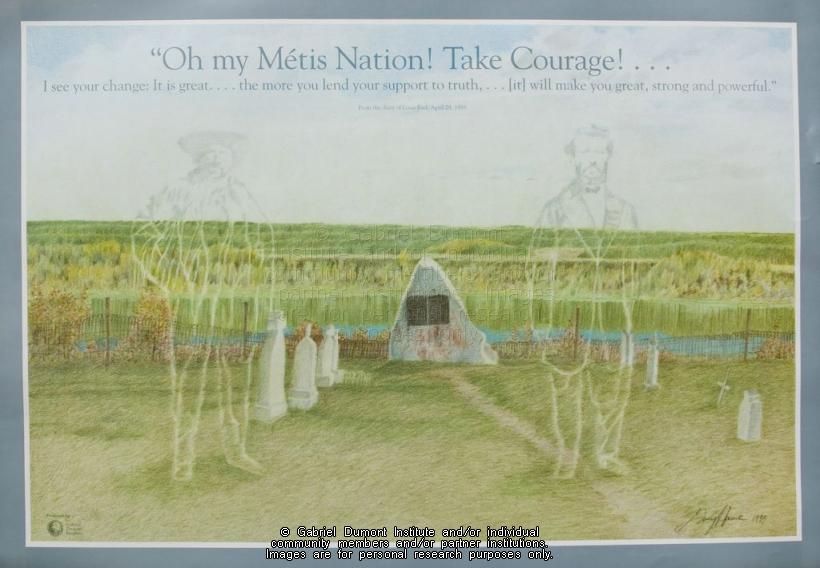 Photograph of a poster. This poster gives hope and inspiration to the entire Métis Nation as it strives towards its ultimate goal of self-government. This poster reunites the spirits of past leaders, Gabriel Dumont and Louis Riel, at Dumont’s gravesite. An appropriate quote from Riel’s diary dated April 29, 1885 is contained on the poster: “Oh my Métis Nation! Take Courage…I see your change: It is great…the more you lend your support to truth,... [it] will make you great, strong and powerful.” |