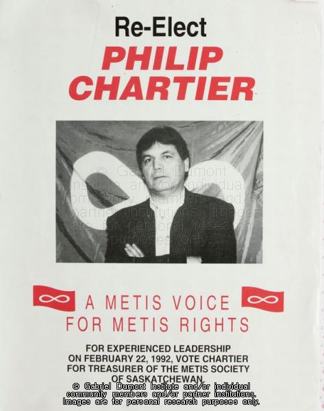 | Description: | "Re-elect Philip Chartier, a Métis Voice for Métis Rights" election poster. |