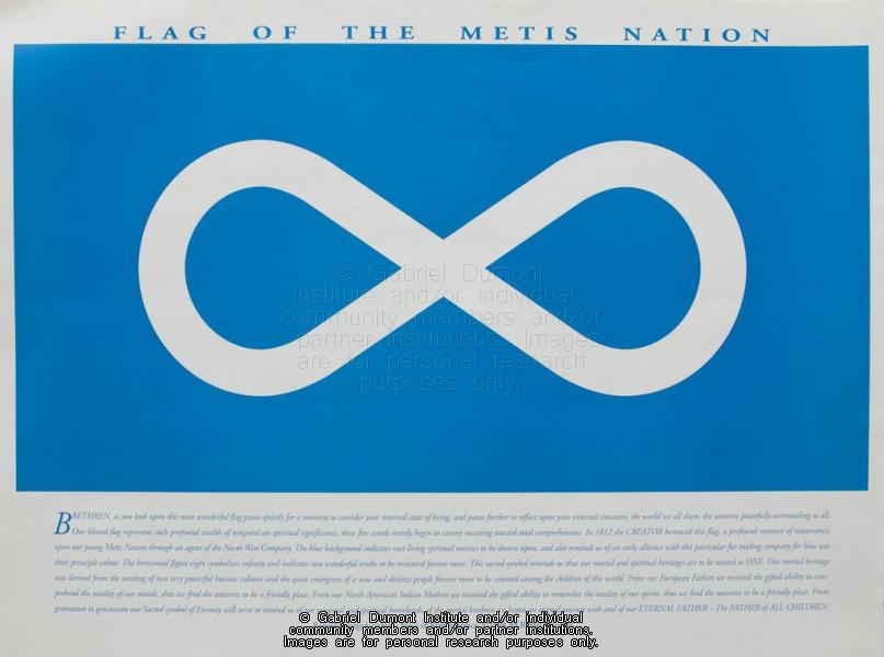 Poster portraying the flag of the Métis Nation, with text by Ronald George Gordon from Voice of Remembrance, 1996: "Brethren, as you look upon this most wonderful flag pause quietly for a moment to consider your internal state of being, and pause further to reflect upon your external situation, the world we share, the universe peacefully surrounding us all. Our blessed flag represents such profound wealth of temporal and spiritual significance, these few words merely begin to convey meaning toward total comprehension. In 1812 the CREATOR bestowed this flag, a profound measure of reassurance, upon our young Métis Nation through an agent of the North West Company. The blue background indicates vast living spiritual reserves to be drawn upon, and also reminds us of an early alliance with this particular fur trading company for blue was their principle colour. The horizontal figure eight symbolizes infinity and indicates two wonderful truths to be treasured forever more. This sacred symbol reminds us that our mortal and spiritual heritages are to be united as ONE. Our mortal heritage was derived from the meeting of two very powerful human cultures and the quiet emergence of a new and distinct people forever more to be counted among the children of this world. From our European Fathers we received the gifted ability to comprehend the totality of our minds, thus we find the universe to be a friendly place. From our North American Indian Mothers we received the gifted ability to remember the totality of our spirits, thus we find the universe to be a friendly place. From generation to generation our Sacred symbol of Eternity will serve to remind us of our temporal and spiritual homelands, of the mortal brethren we began an eternal journey with and of our ETERNAL FATHER – The FATHER of ALL CHILDREN.” |