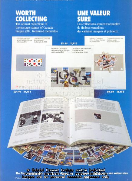 | Description: | Canada Post poster, "Worth Collecting," illustrates stamps issued in 1983, 1984, and 1985, including Gabriel Dumont stamp, as seen in foreground. |