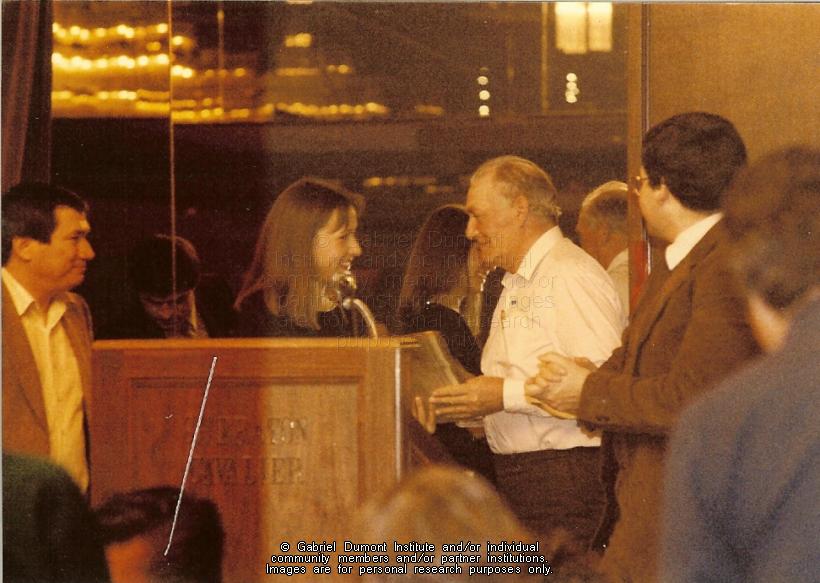 Description: SUNTEP Saskatoon graduation in the mid 190s. Present were (Left to Right): Keith Goulet, Rita Bouvier, Vital Morin, and Christopher LaFontaine.