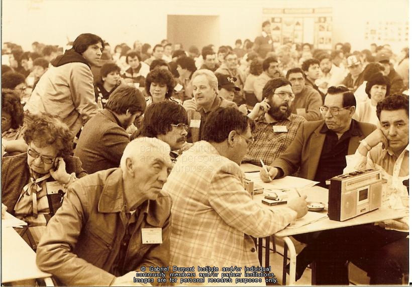| Description: | Kenn Whyte (glasses and beard) and Clarence Trotchie (dark shirt and dress coat) at an early Gabriel Dumont Institute cultural conference. |