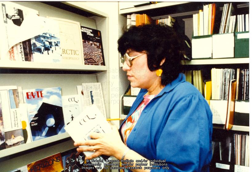 | Description: | Melona Palmer at Gabriel Dumont Institute Library.