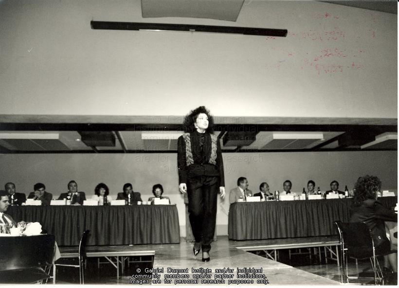 Description: Gayle Bitternose, fashion model, during the banquet of the 1987 Gabriel Dumont Institute cultural and educational conference, Regina