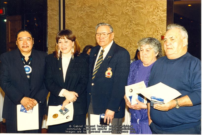 Order of Gabriel Dumont recipients at the Gabriel Dumont Institute "Education and the Family" Cultural and Educational Conference, Saskatoon, 1991. Left to right: Elijah Harper, Ethel Blondin, Edward King, Grace Hatfield, and Louis Morin. |