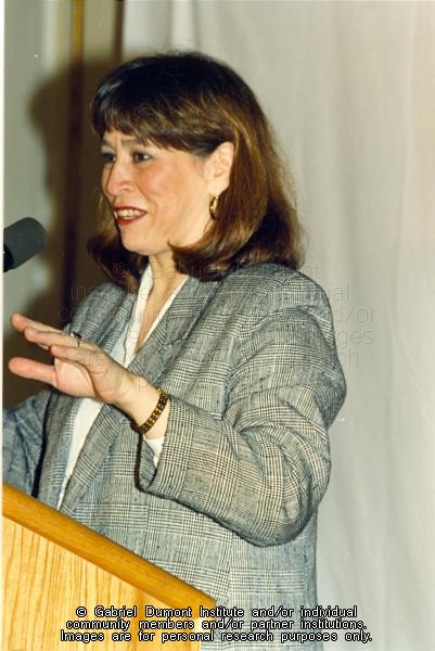 Ethel Blondin, Order of Gabriel Dumont recipient, at the Gabriel Dumont Institute "Education and the Family" Cultural and Educational Conference, Saskatoon, 1991. |