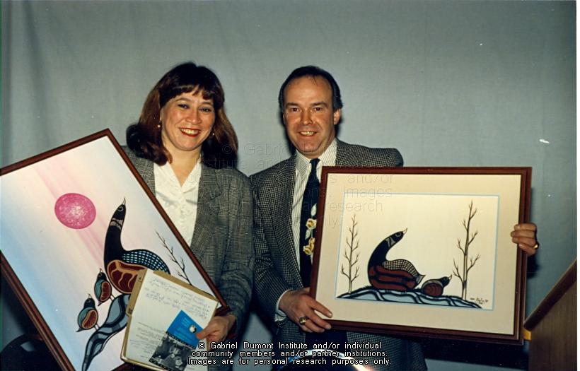 Ethel Blondin, Order of Gabriel Dumont recipient, and Grant Devine, Premier of Saskatchewan, at the Gabriel Dumont Institute "Education and the Family" Cultural and Educational Conference, Saskatoon, 1991. |