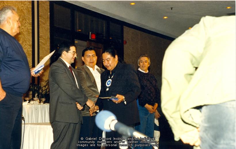 Christopher LaFontaine, Executive Director, Gabriel Dumont Institute, shaking hands with and congratulating Elijah Harper, Order of Gabriel Dumont recipient, at the Gabriel Dumont Institute "Education and the Family" Cultural and Educational Conference, Saskatoon, 1991. Louis Morin, Martin Durocher, and Jim Favel (left to right) look on. |