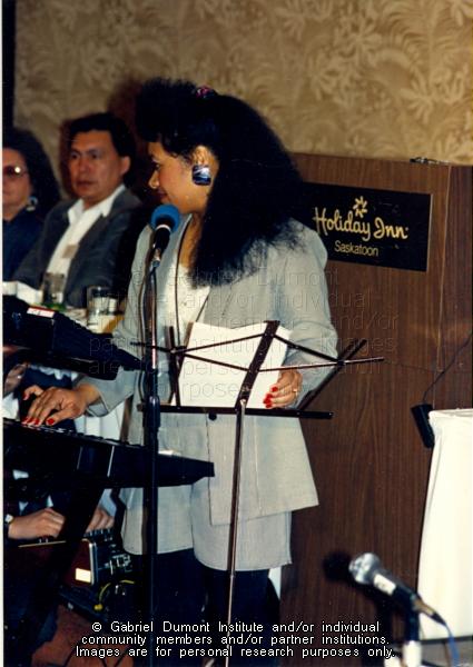 | Description: | Lani LaFontaine, wife of Christopher LaFontaine, Executive Director, Gabriel Dumont Institute, at the Gabriel Dumont Institute "Education and the Family" Cultural and Educational Conference, Saskatoon, 1991. |