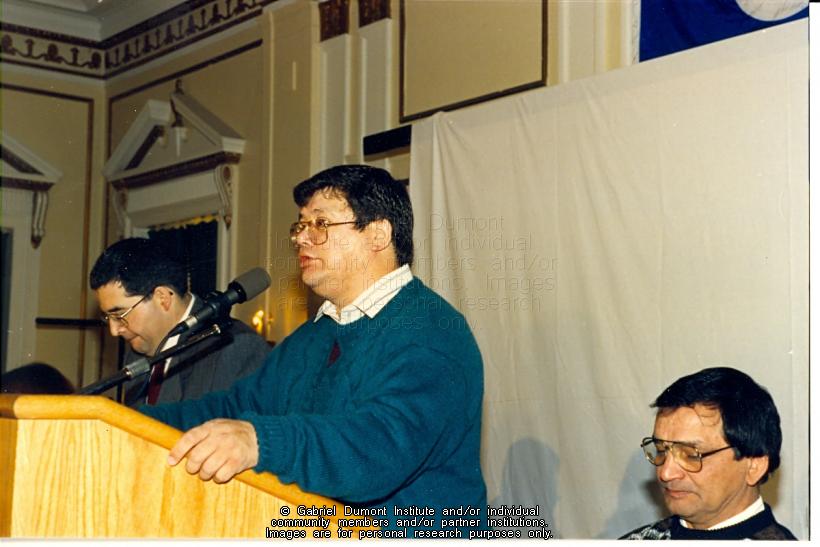 | Description: | Christopher LaFontaine, Executive Director, Gabriel Dumont Institute, Max Morin, Chairperson, Gabriel Dumont Institute Board of Governors, and Jim Durocher, President of the Métis Society of Saskatchewan, at the Gabriel Dumont Institute "Education and the Family" Cultural and Educational Conference, Saskatoon, 1991. |