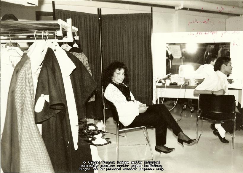 Description: Gayle Bitternose, fashion model, backstage at a fashion show, during the banquet at the 1987 Gabriel Dumont Institute cultural and educational conference, Regina.