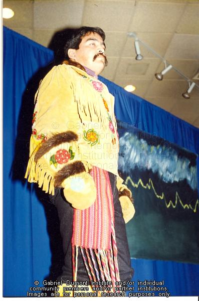 | Description: | An unidentified man during the fashion show at a Gabriel Dumont Institute Cultural Conference, Saskatoon. |