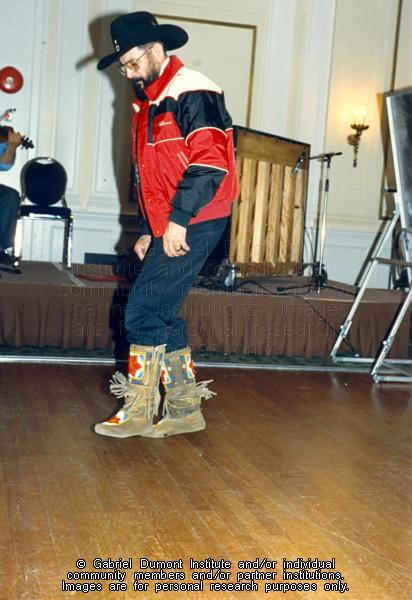 | Description: | George Lafleur jigging at the Gabriel Dumont Institute "Education and the Family" Cultural and Educational Conference, Saskatoon, 1991. |