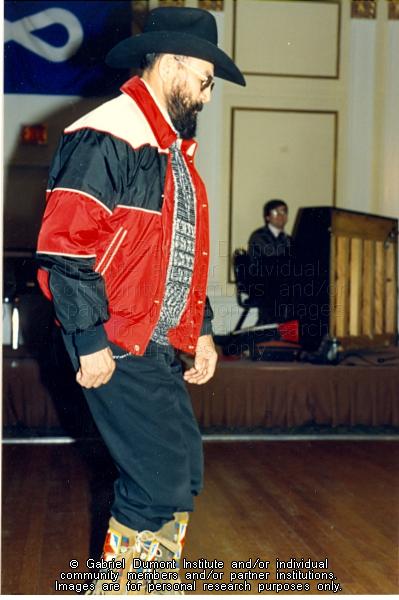 | Description: | George Lafleur jigging at the Gabriel Dumont Institute "Education and the Family" Cultural and Educational Conference, Saskatoon, 1991. |