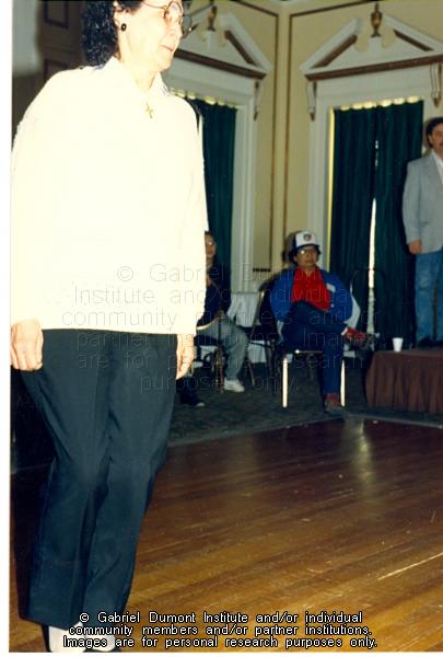 | Description: | An unidentified woman jigging at the Gabriel Dumont Institute "Education and the Family" Cultural and Educational Conference, Saskatoon, 1991. |