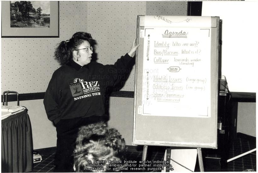 | Description: | Facilitator in a session at the Gabriel Dumont Institute cultural and educational conference in Saskatoon in 1993. |