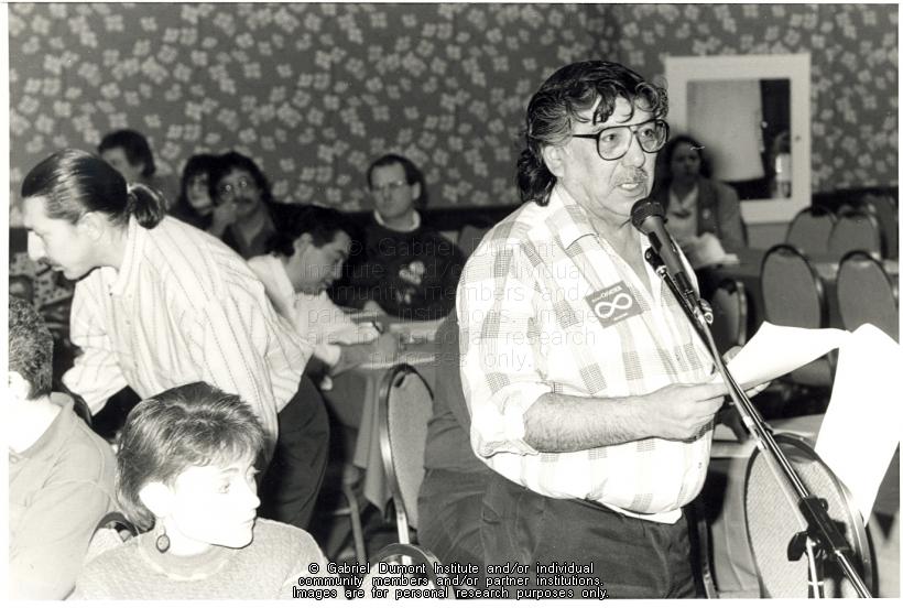 | Description: | Roy Fosseneuve speaking at the Gabriel Dumont Institute cultural conference in Saskatoon in 1993. |