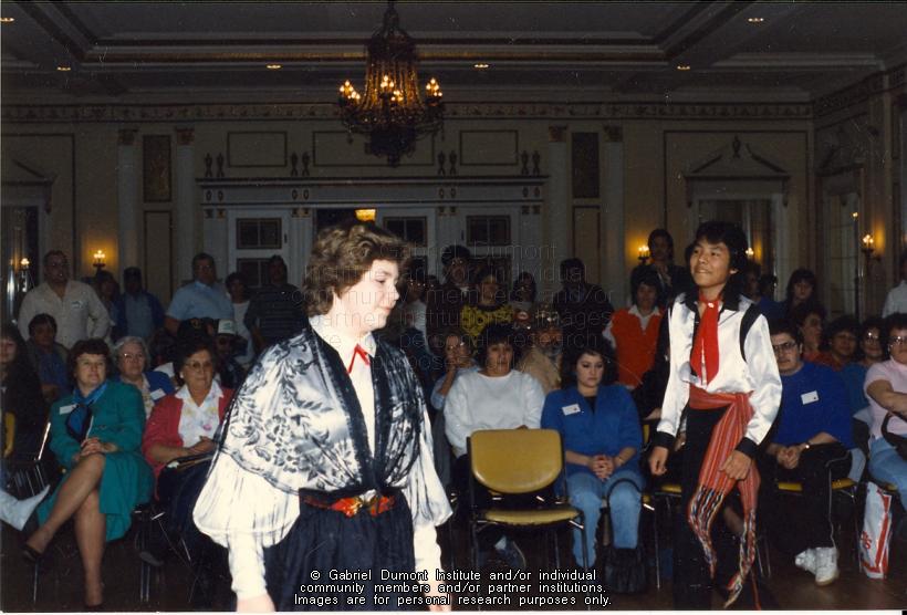 | Description: | Métis square dancers at a Gabriel Dumont Institute cultural conference. |