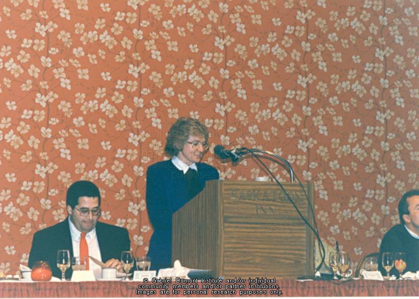| Description: | Christopher LaFontaine sitting down while a woman speaks at the podium of a GDI cultural conference. |