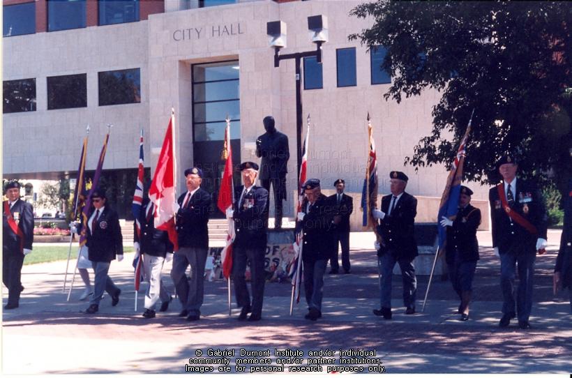 | Description: | Honour Guard in front of City Hall in Prince Albert just before the Métis Veterans' book launch. |