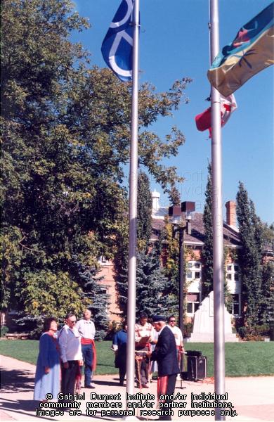 | Description: | Honour Guard with Max Lucier putting up Métis flag in front of City Hall in Prince Albert just before the Métis Veterans' book launch. |