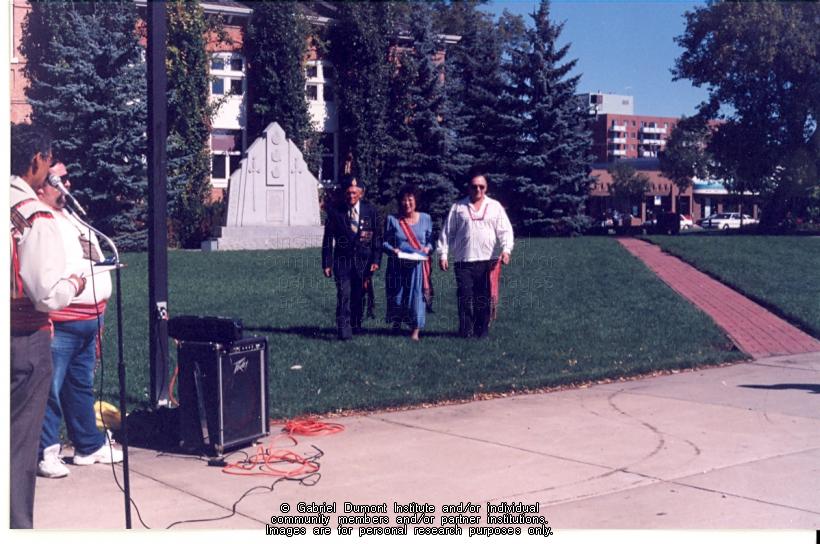 | Description: | Louis Dorion introducing guests in front of City Hall in Prince Albert just before the Métis Veterans' book launch. |
