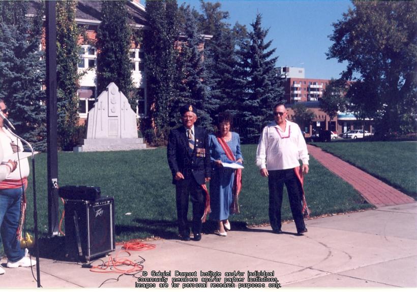 | Description: | Louis Dorion introducing Max Lucier in front of City Hall in Prince Albert just before the Métis Veterans' book launch. |