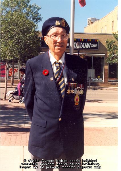 | Description: | Métis veteran, Lawrence Sayese, Honour Guard, near City Hall in Prince Albert just before the Métis Veterans' book launch. |