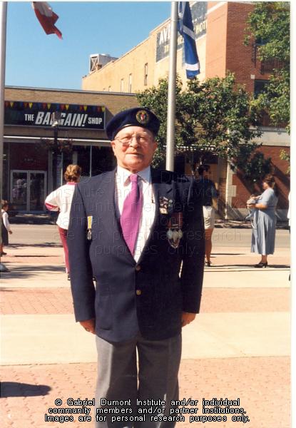 | Description: | Métis veteran Bernard Paul near City Hall in Prince Albert just before the Métis Veterans' book launch. |