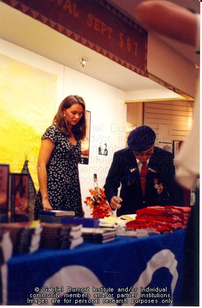 | Description: | Leah Dorion with veteran Frank Tomkins, Métis veteran, Max Lucier in Prince Albert at the Métis veterans' book launch. |