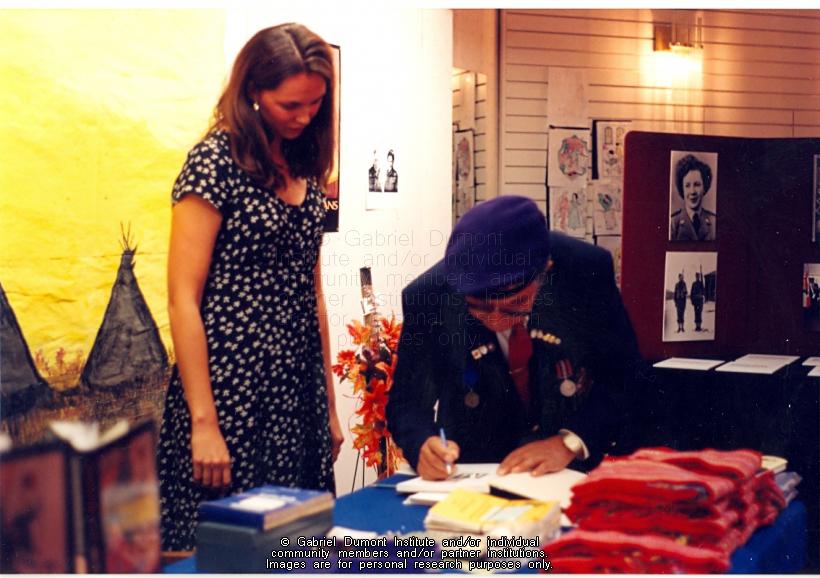| Description: | Leah Dorion with Frank Tomkins, Métis veteran, in Prince Albert at the Métis veterans' book launch. |