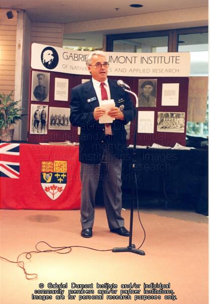 | Description: | Spokesperson for the Army, Navy, Air Force Veterans Association speaking in Prince Albert at the Métis veterans' book launch. |