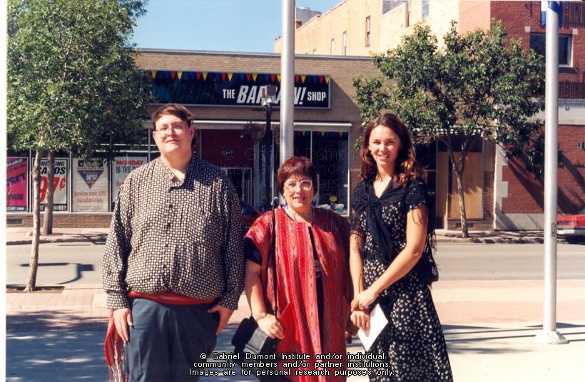 | Description: | Darren R. Prefontaine, Karon Shmon and Leah Dorion in Prince Albert before the Métis veterans' book launch. |