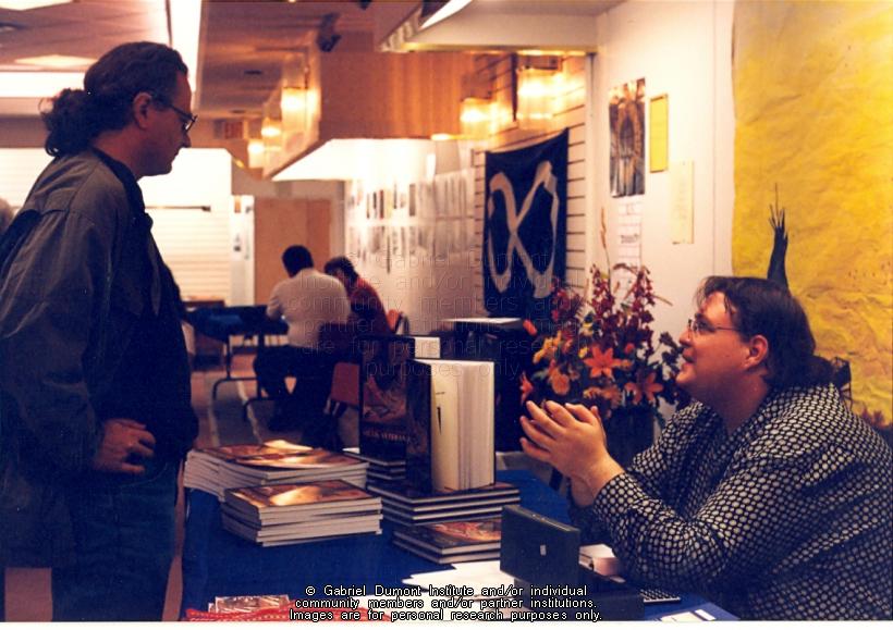| Description: | Darren Prefontaine talking with Professor Frank Tough at book launch for Remembrances: Métis Veterans in Prince Albert. |