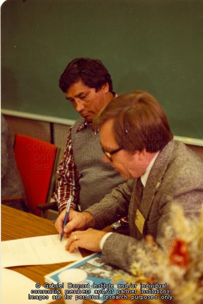This photograph is the official signing ceremony for the Gabriel Dumont Institute in Regina in 1980. An official from the government or one of the province`s two universities signs the founding document as Association of Métis and Non-Status Indians of Saskatchewan President Jim Sinclair looks on. |
