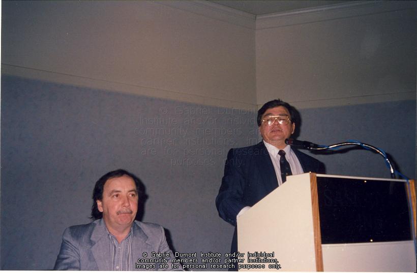 | Description: | Murray Hamilton, left, with Yvon Dumont at the podium. |