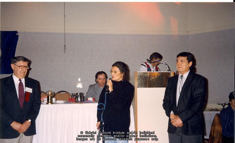 | Description: | Maria Campbell, centre, with Philip Chartier at a community event. Albert Robillard and Murray Hamilton look on in the backgound. |