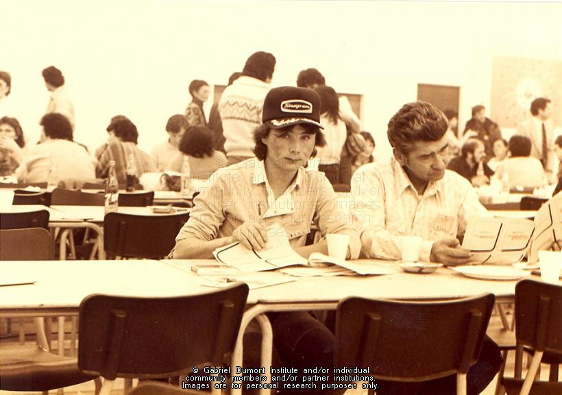 This photograph was taken during the opening conference for the Gabriel Dumont Institute in 1980. In 1976, an assembly of the Association of Métis and Non-Status Indians voted to create an educational and cultural institution for the province`s Métis and Non-Status Indians. In this photograph, two unknown men are seated at a table at the Gabriel Dumont Institute`s opening conference. |