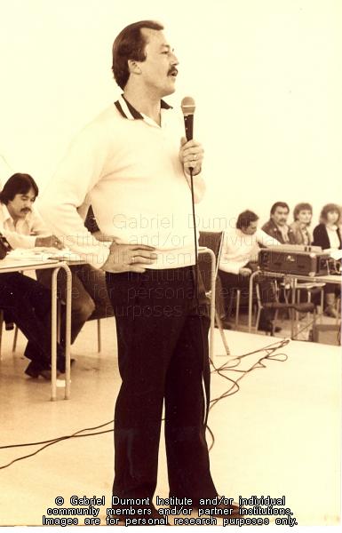 This photograph was taken during the opening conference for the Gabriel Dumont Institute in 1980. In 1976, an assembly of the Association of Métis and Non-Status Indians (AMNSIS) voted to create an educational and cultural institution for the province`s Métis and Non-Status Indians. In this photograph, Wayne McKenzie speaks to the AMNSIS membership regarding the new Institute`s mandate. |