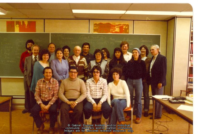 | Description: | The Gabriel Dumont Institute board in 1980: prominent among these board members are Jim Sinclair (back--centre) and Frank Tomkins (beige sweater, front row), board chair. |